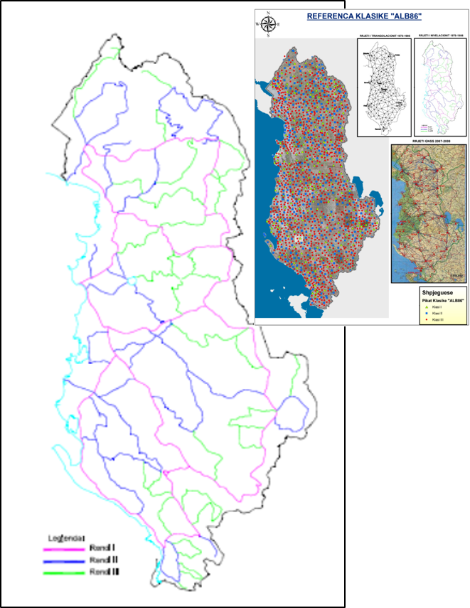 - “Rrjeti i nivelimit shtetëror” u zhvillua në tre rende me gjatësi të përgjithshme të vijave të nivelimit prej 4200 km, ku në çdo 5 km janë fiksuar marka apo reperë nivelimi. Ky rrjet përbëhet nga 900 pika, me një dëndësi mesatare 1 pikë nivelimi për rreth 31km2 .