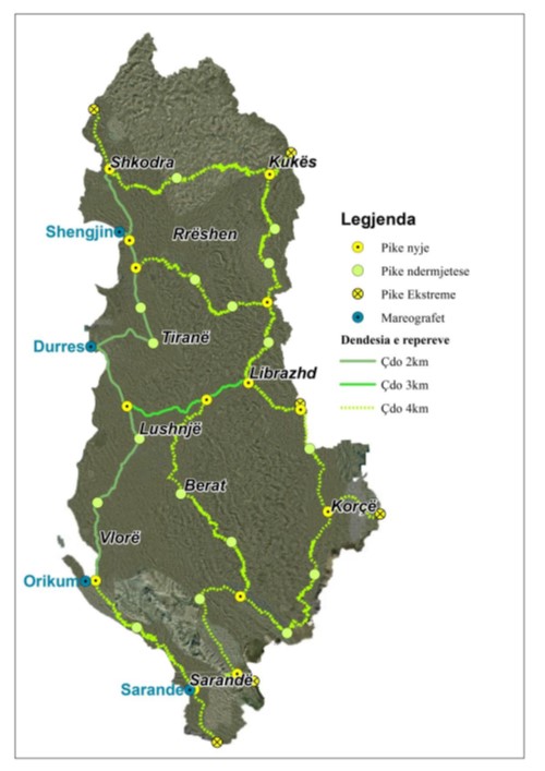 si dhe nga 18 pika ndërmjetëse, dhe të gjitha këto do jenë edhe pika të përbashkëta me pikat e rrjetit GNSS dhe rrjetit Gravimetrik të rendit parë.